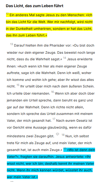 12"Ein anderes Mal sagte Jesus zu den Menschen: »Ich bin das Licht für die Welt. Wer mir nachfolgt, wird nicht in der Dunkelheit umherirren, sondern er hat das Licht, das ihn zum Leben führt.«"